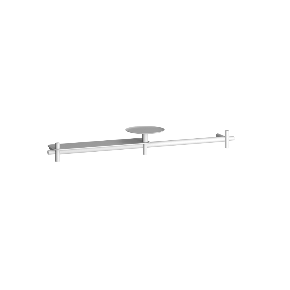 This configuration echoes the typical lines of the Buck collection and includes a towel rack and shelf each 40 cm long, embellished by a convenient circular small plate with a diameter of 14.5 cm. This composition is perfect for furnishing in a compact and functional way not only the bathroom, but also the entrance hall and why not, even the bedroom. The plate is made of steel, the shelf of aluminum, and the rest of the structure is made of zamak and aluminum. Available in two finishes like the rest of the collection: matte white and matte black. The whole structure is 73,4 cm long.