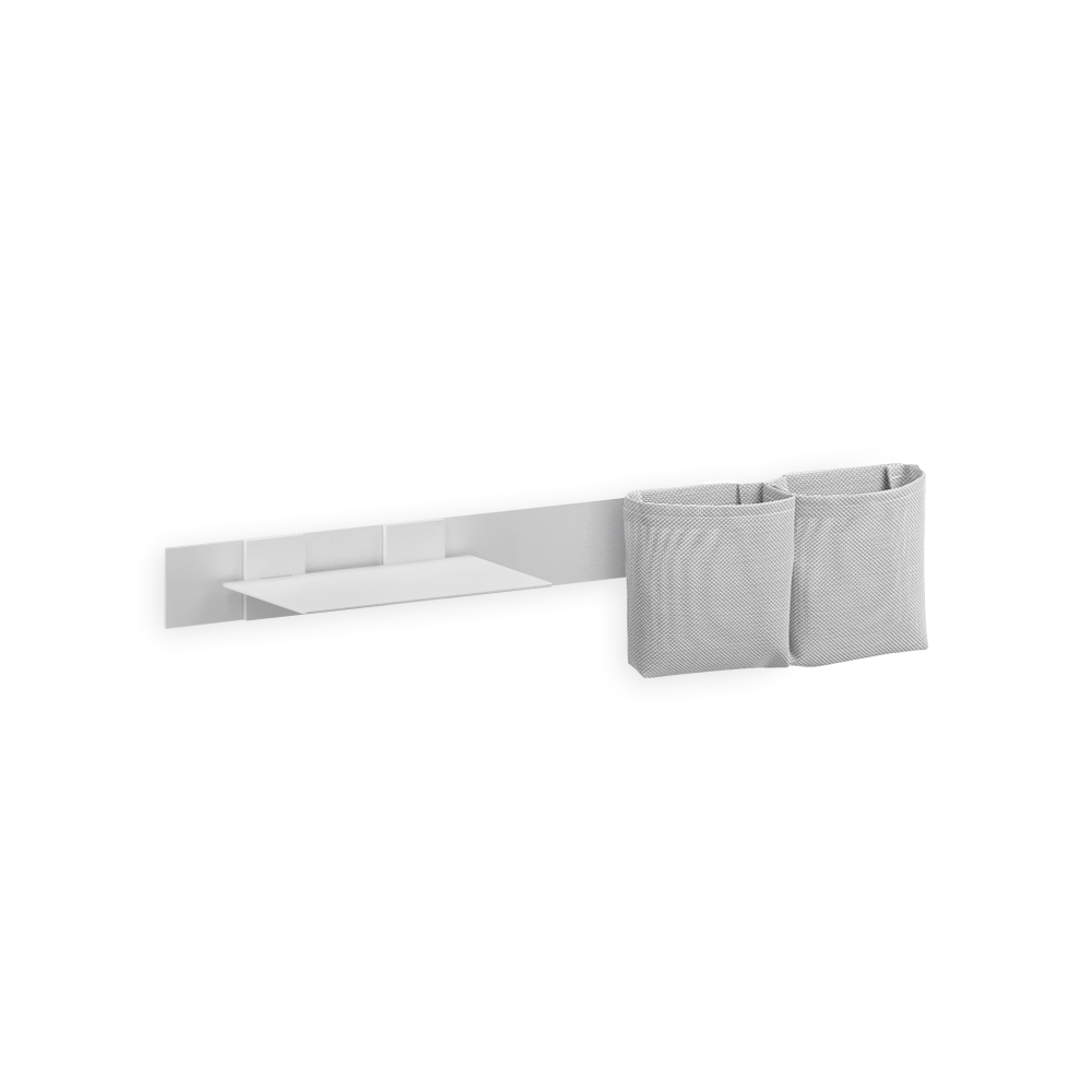 Thanks to the metal band (90 cm long), that is attached to the wall using a double-sided adhesive system, the Click system allows for various accessory compositions. This configuration consists of a metal band and various accessories including a double shelf and a double basket, which are affixed to the band through a magnet system. The band and shelf are made of painted steel and are available in mat white and mat black, while the double basketball is made of PVC and PES (water resistant material) and is available in ice gray for the mat white configuration and in black for the mat black configuration.