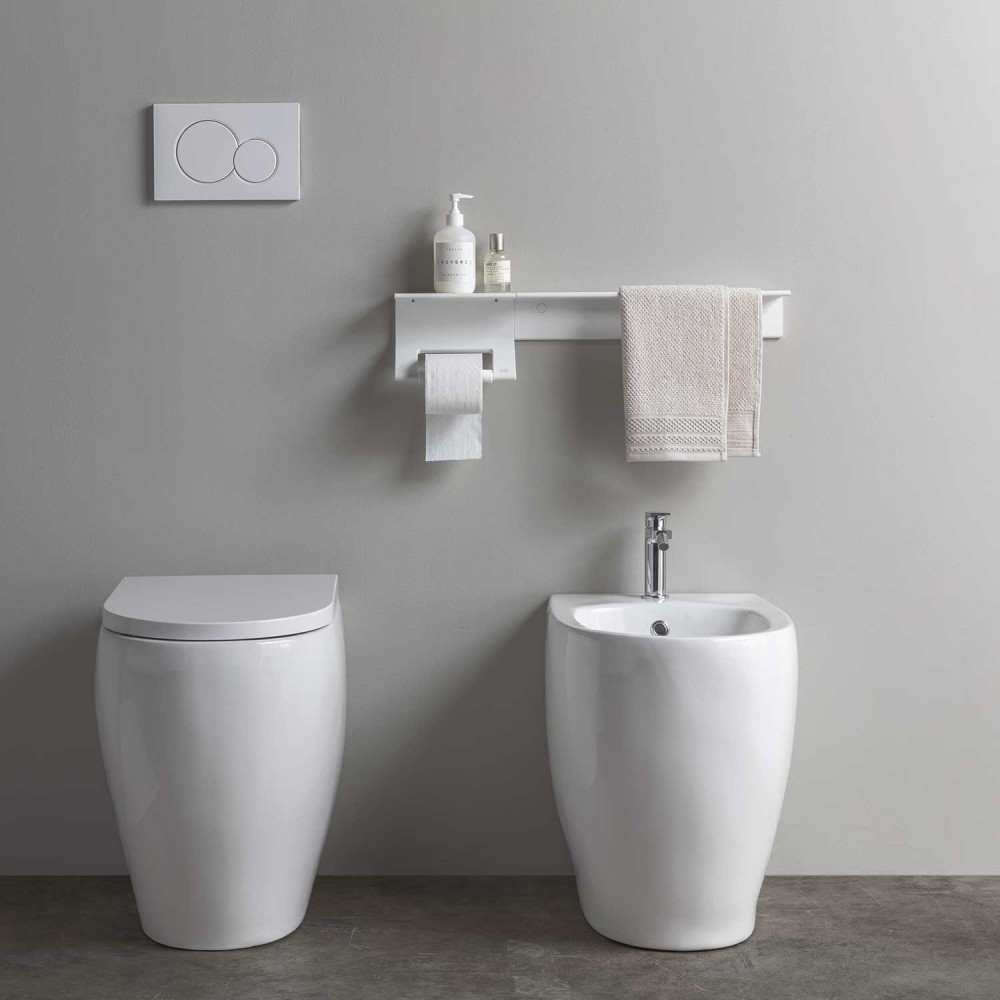 Toilet roll holder for the bathroom and wall shelf, in a combination functional and charming at the same time. The composition matches together with the toilet roll holder of the iconic collection Lissom together with the towel holder of the collection Lissom Slim. All together they complete the bathroom with a modern but elegant style. The toilet roll holder has an integrated shelf 10 cm wide and 20 cm long. You can combine the pieces in the following way: