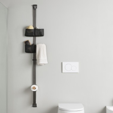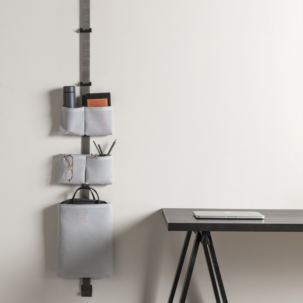 Basket made of technical fabric and is perfect for home and bathroom accessories, provided with an aluminium bracket, painted mat black. The basket is strong, it is fixed to the band thanks to a very easy fixation system to TAPE STORAGE. The bracket is inserted in the loops of the band TAPE. The position of installation changes considering your different needs and the combination that you want to create. Colors available: black and ice grey mélange. |