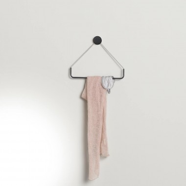 This towel holder with triangular shape of RING collection is an original design accessory. Its shape is studied to be minimal in order to be perfect in every space and with every style. This towel holder is very versatile: it can be used in the bathroom or in the kitchen, for towels or dish towels, to keep the room tidy. The fixing point is hidden inside a cylindrical wood element, that in the lower part has a nylon rope on which there is a triangular structure made on brass. Its particular shape is for sure a feature that gives to this product a clear and unique style.