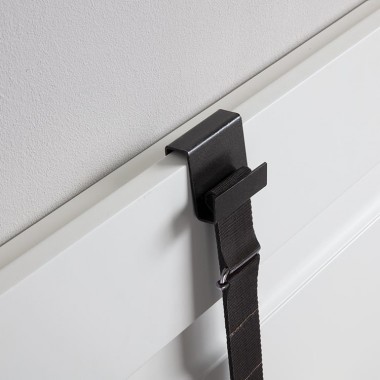Fascia per porta di lunghezza di 2 mt con struttura ad asole da 50 mm, all’interno delle quali si possono inserire diversi accessori. Il fissaggio avviene tramite ganci in acciaio spessi 1 mm, verniciati colore nero opaco. I ganci tendono la fascia di modo che, una volta accessoriata questa resti in tenione.