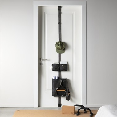 Fascia collezione TAPE con fissaggio alla porta mediante ganci sottili 1 mm. Lungo la lunghezza la fascia è costituita da asole entro cui è possibile inserire i basket contenitori portaoggetti, il gancio appendi abiti ed il portarotolo. La fascia accessoriata diventa un contenitore portaoggetti per la porta che occupa poco spazio ed ha un design lineare e pulito. In polipropilene. Lunghezza 2mt.